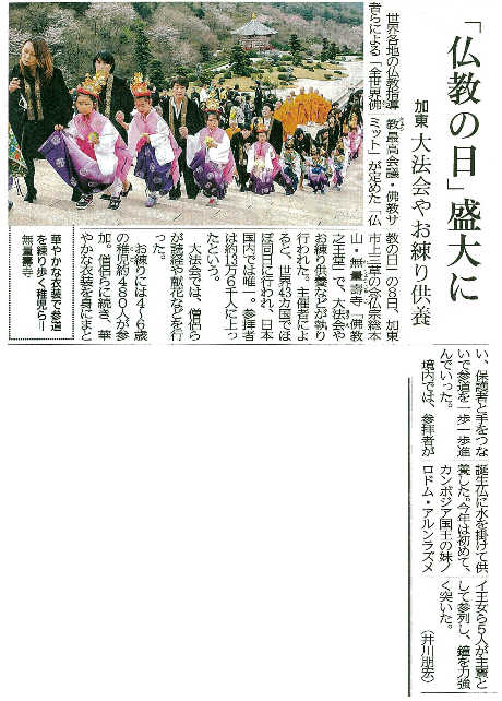 第三回「仏教の日」を終えて、毎日新聞・神戸新聞・ジャパンタイムズ・毎日小学生新聞などの各紙朝刊に、約13 万6 千人の方々が、釈尊の御生誕をお祝いするために念佛宗総本山「佛教之王堂」に参詣し、「仏教の日」大法会やお練り供養が盛大に行われたことが、写真付きで詳しく報道されました。