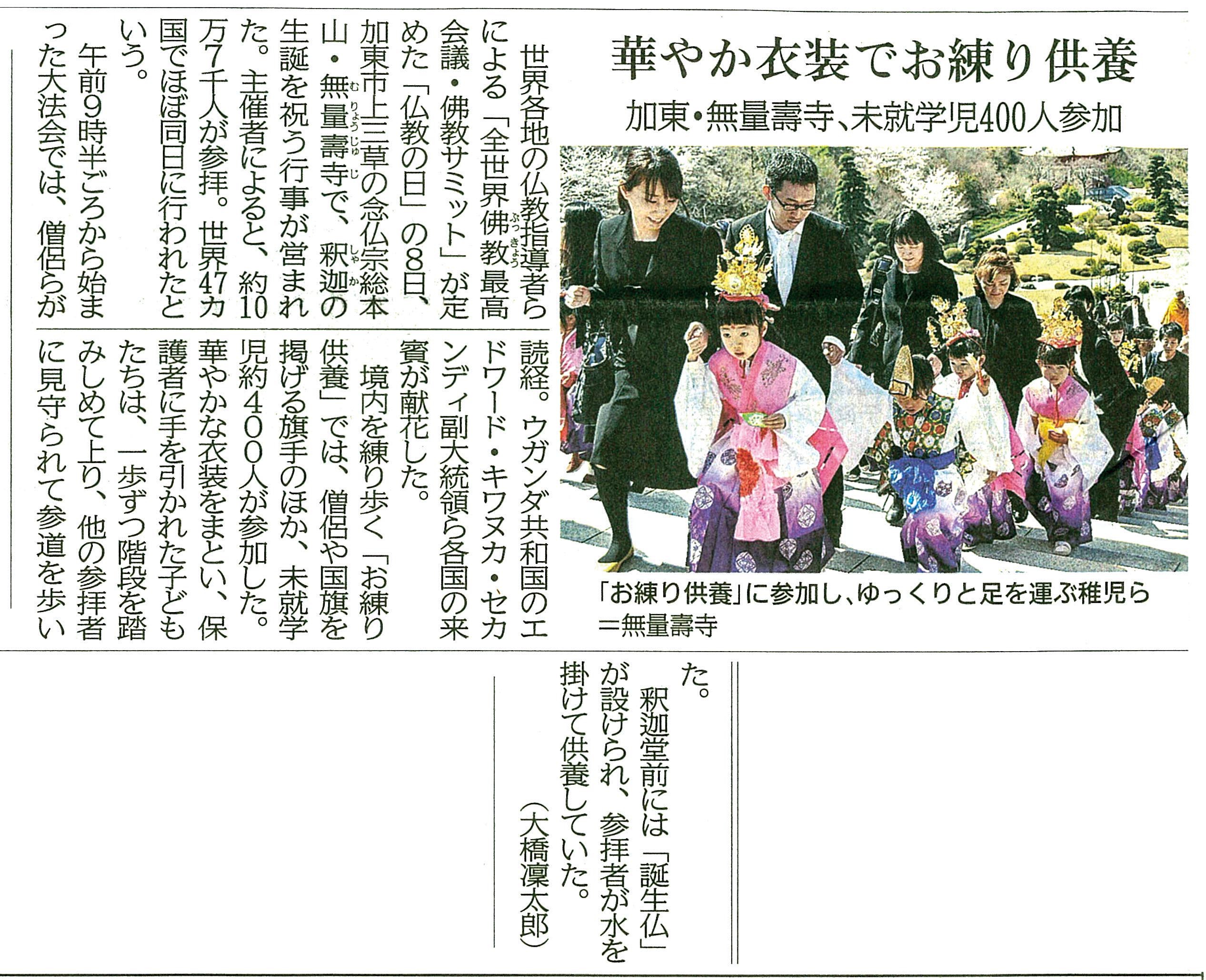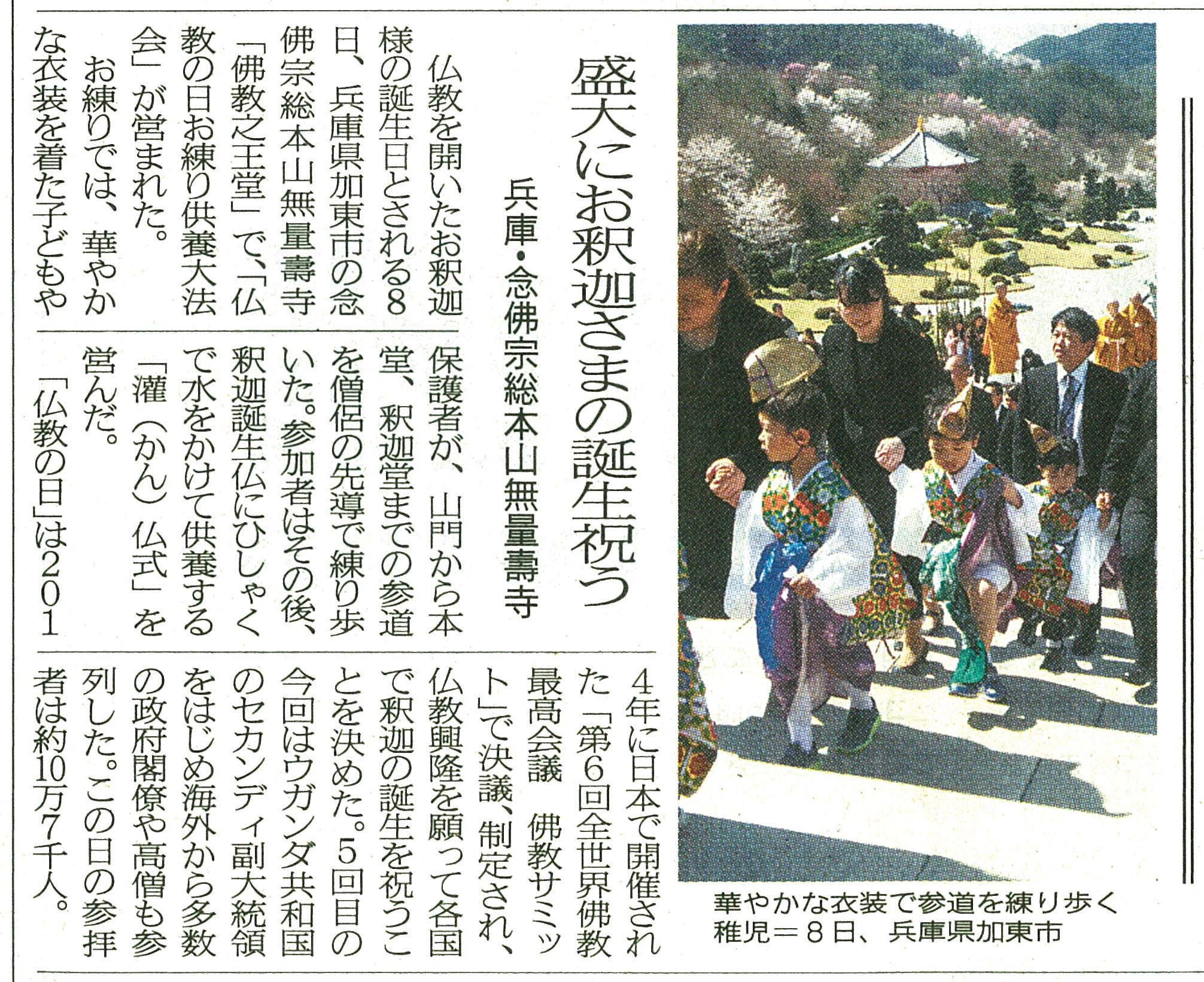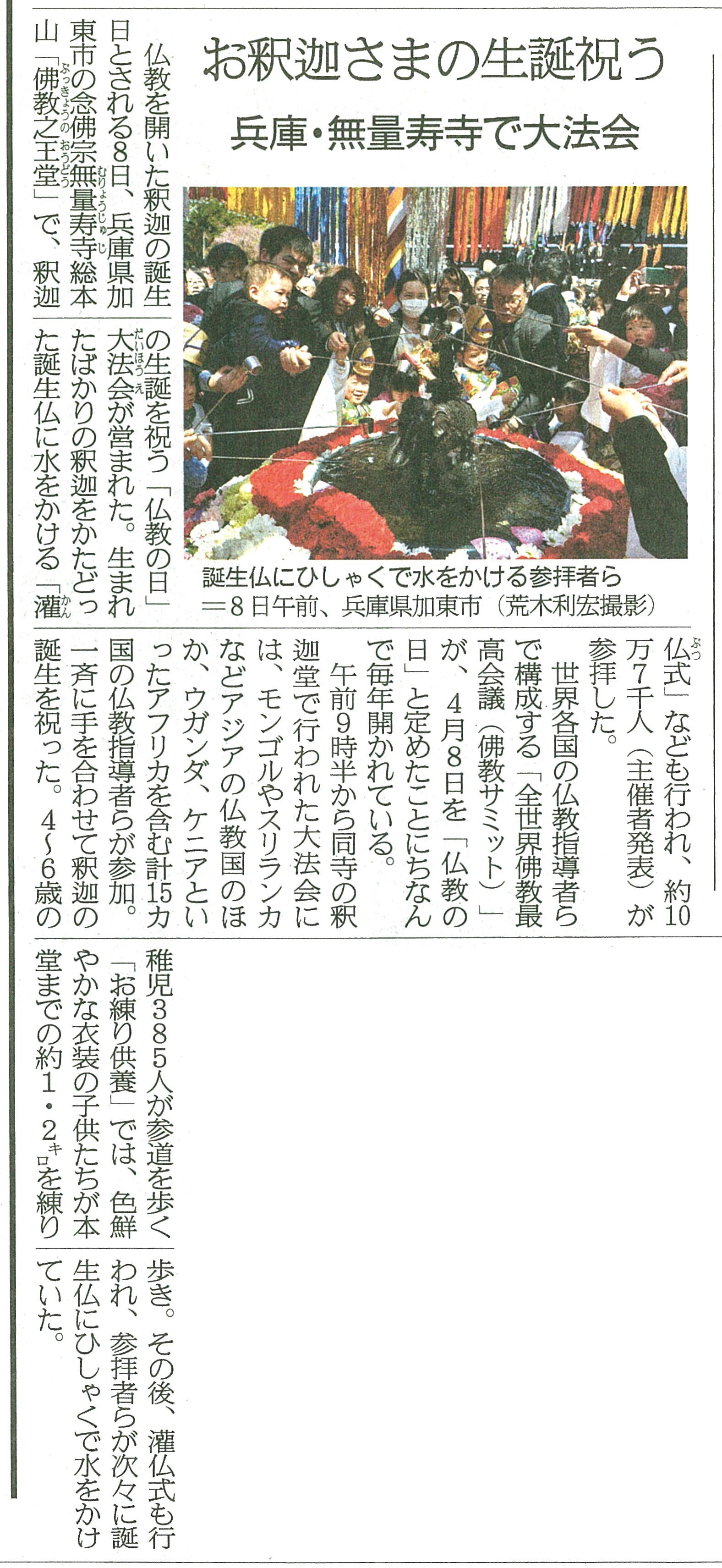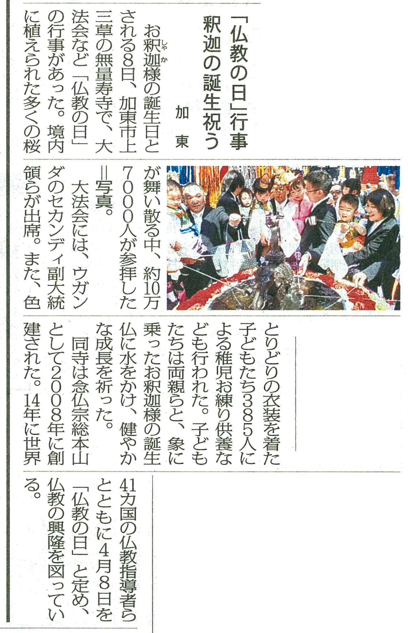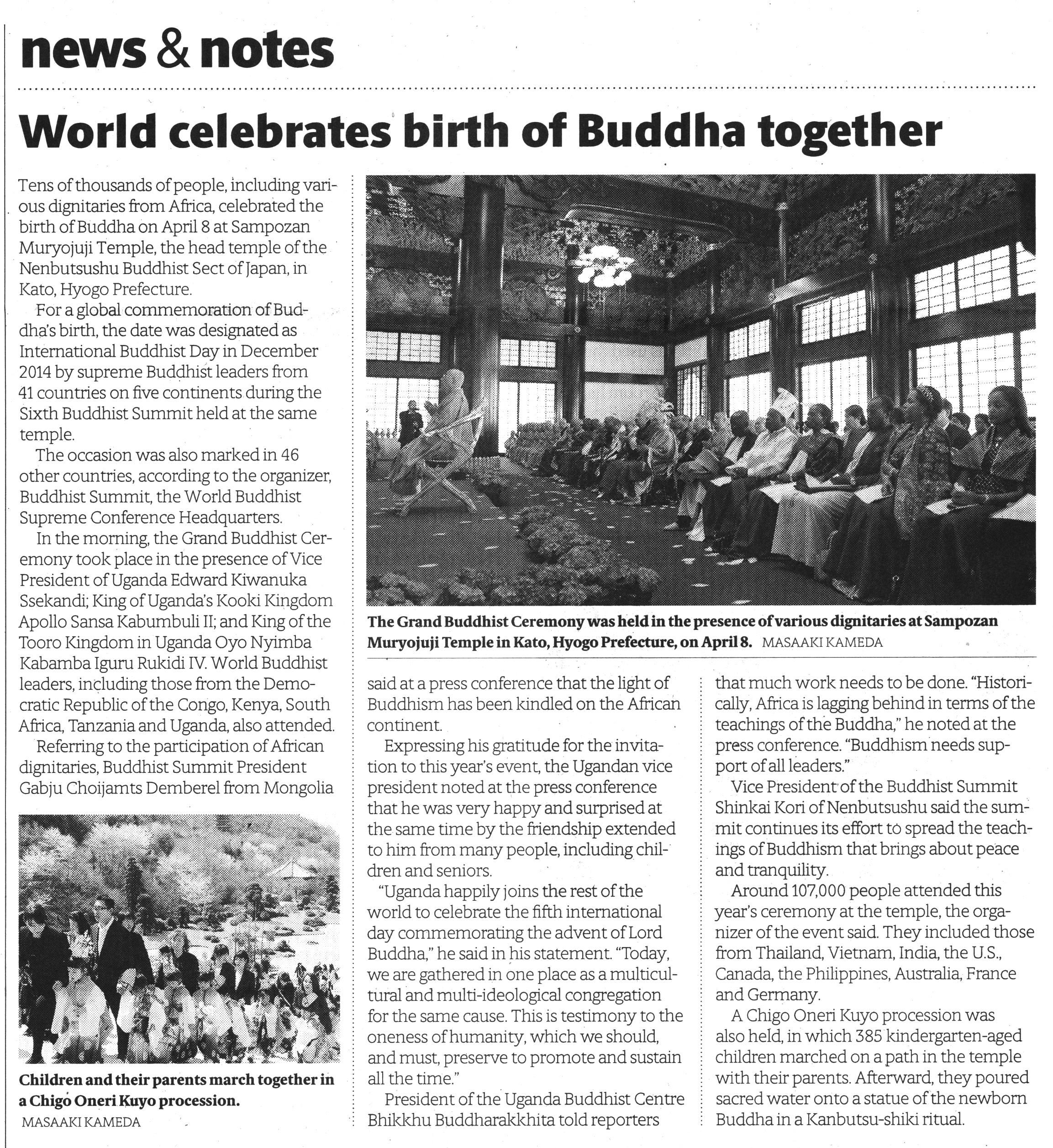 NTV ウガンダや、『サンデー毎日』の特集、読売新聞、毎日新聞、産経新聞などの全国紙を始め、神戸新聞、奈良新聞などの地元有力紙が、ウガンダ共和国副大統領閣下を迎え、アフリカの国々を始めとする世界8 ヶ国の仏教指導者・11 ヶ国の駐日特命全権大使閣下と共に釈尊の御生誕を祝い、アフリカ大陸に仏教の燈が灯った「仏教の日」を、報道しました。