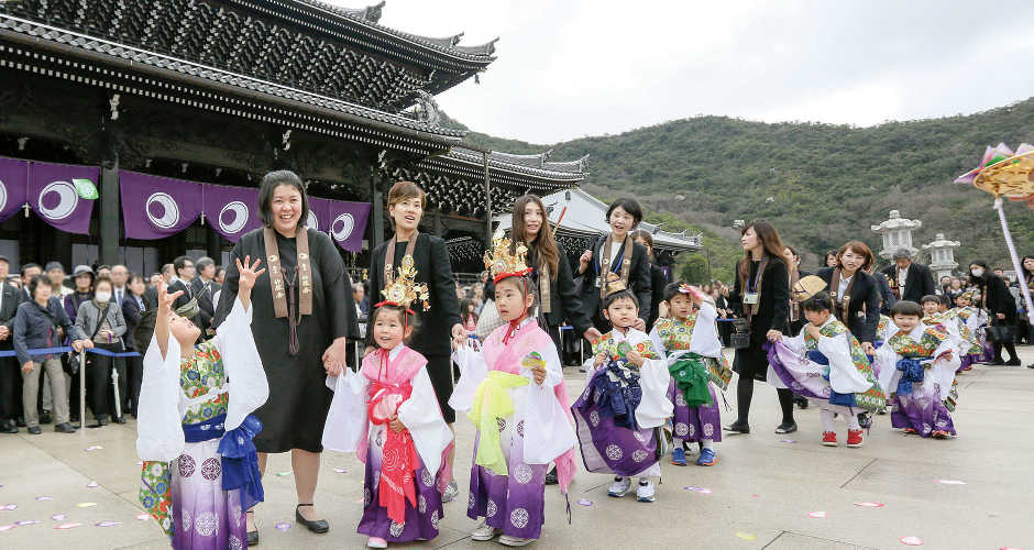 山門より総門まで続く行列 約480名もの稚児が お練りの列をなした