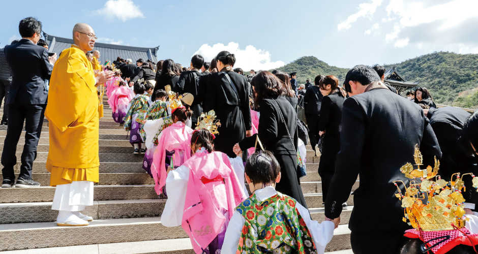 和やかに石段を登る 約600名もの稚児たち 稚児お練りの参加者は 総勢1,500名に上った