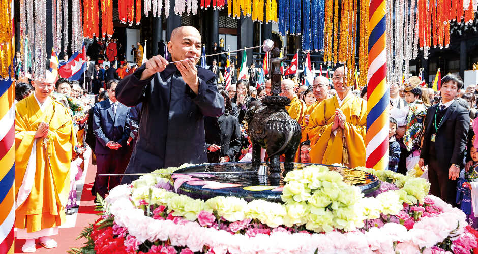 お釈迦様のご生誕を祝して 誕生仏に献花される シハモニ国王陛下