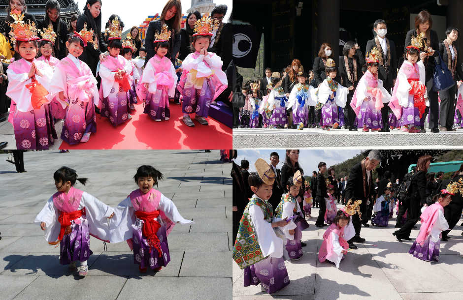 美しい伝統衣装を身にまとい にこやかに歩む 稚児たち