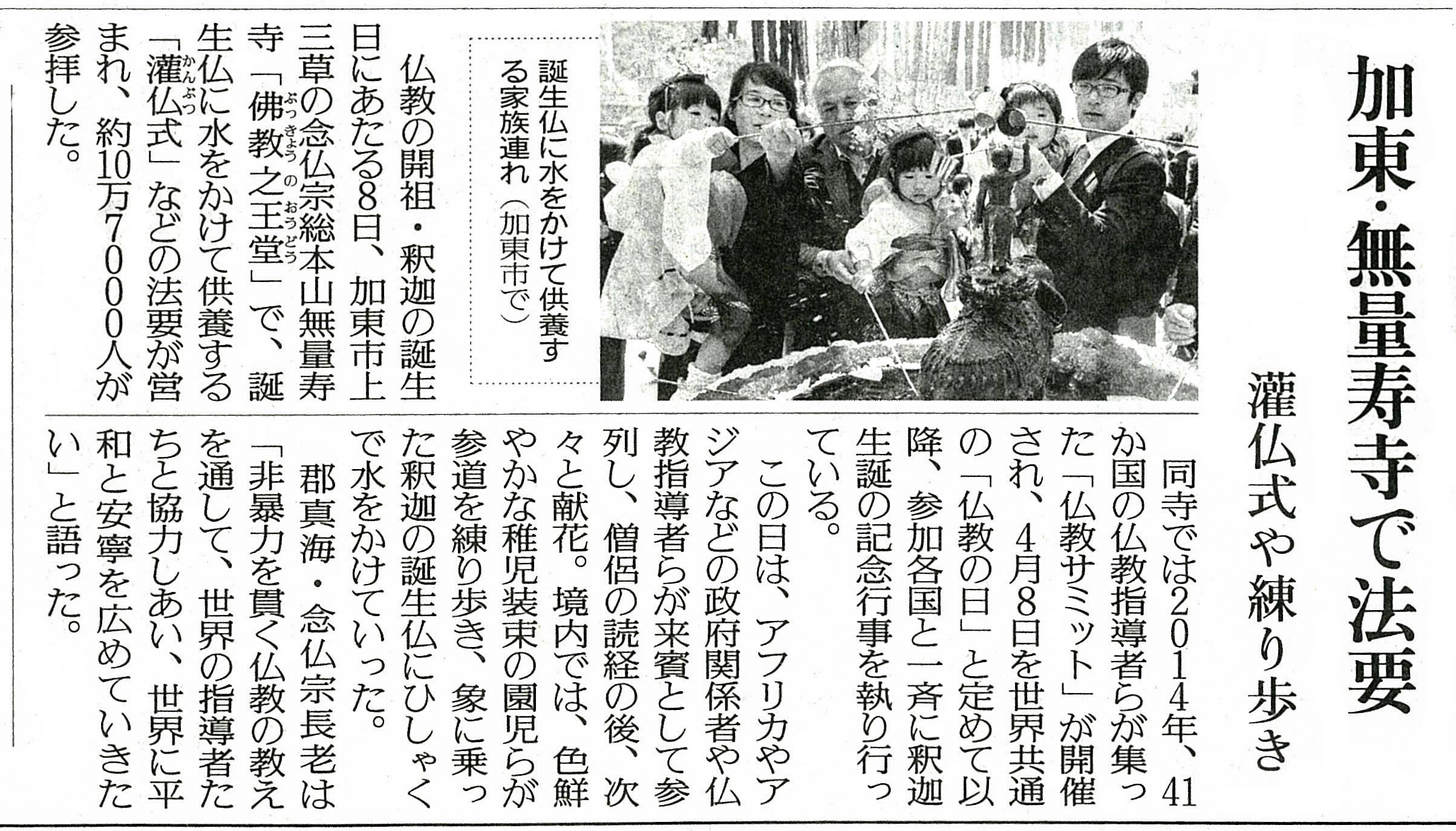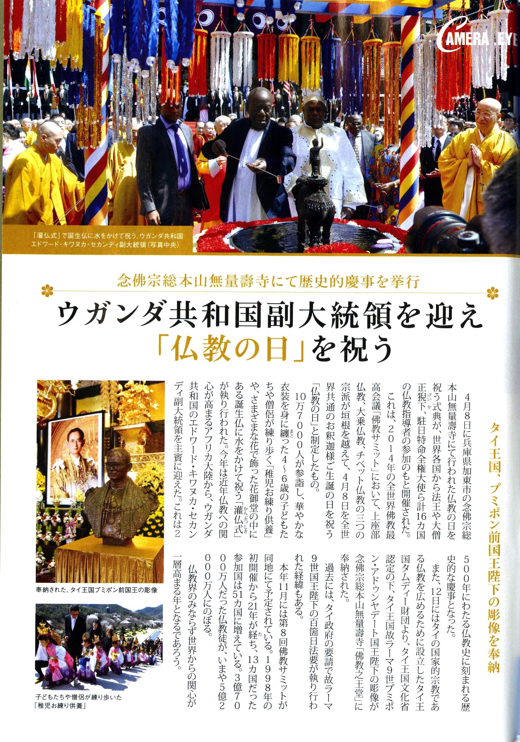 NTV ウガンダや、『サンデー毎日』の特集、読売新聞、毎日新聞、産経新聞などの全国紙を始め、神戸新聞、奈良新聞などの地元有力紙が、ウガンダ共和国副大統領閣下を迎え、アフリカの国々を始めとする世界8 ヶ国の仏教指導者・11 ヶ国の駐日特命全権大使閣下と共に釈尊の御生誕を祝い、アフリカ大陸に仏教の燈が灯った「仏教の日」を、報道しました。