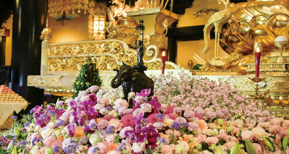 色とりどりの花々に荘厳された祭壇の中央に 「仏教の日」の象徴である