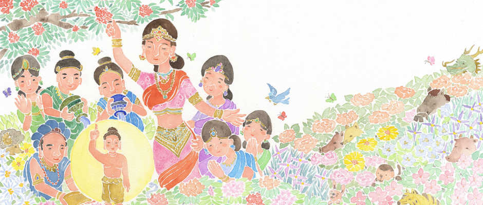 今から2500年前の古、お釈迦様は、ルンビニーという村にある、花々の美しく咲き誇る園林で、お生まれになりました。 お釈迦様のお母上、摩耶夫人は、ある夜、6本の金色の牙を持つ真っ白な象が、 天の彼方から降りてきて、自分のお腹の中に入ってくる夢を見られました。驚かれた摩耶夫人が、王宮でその夢を話されたところ、ある預言者は、母胎に宿った王子は、将来、出家しなければ、天下を治める理想的な王となり、出家すれば、悟りを開いて仏陀となることを告げました。 出産の時期が近づくと、摩耶夫人は、御自身の古里に帰られることになりました。そして、その旅路の途上、ルンビニーの園に立ち寄られた際、摩耶夫人はお釈迦様をお生みになったのです。 お釈迦様が生誕されると、まるでそれを祝うかのように、天から恵みの雨が降り、大地は震動し、鳥のさえずりが響きわたり、草花は美しく咲き誇ったといいます。 時は、4月8日のことでした。