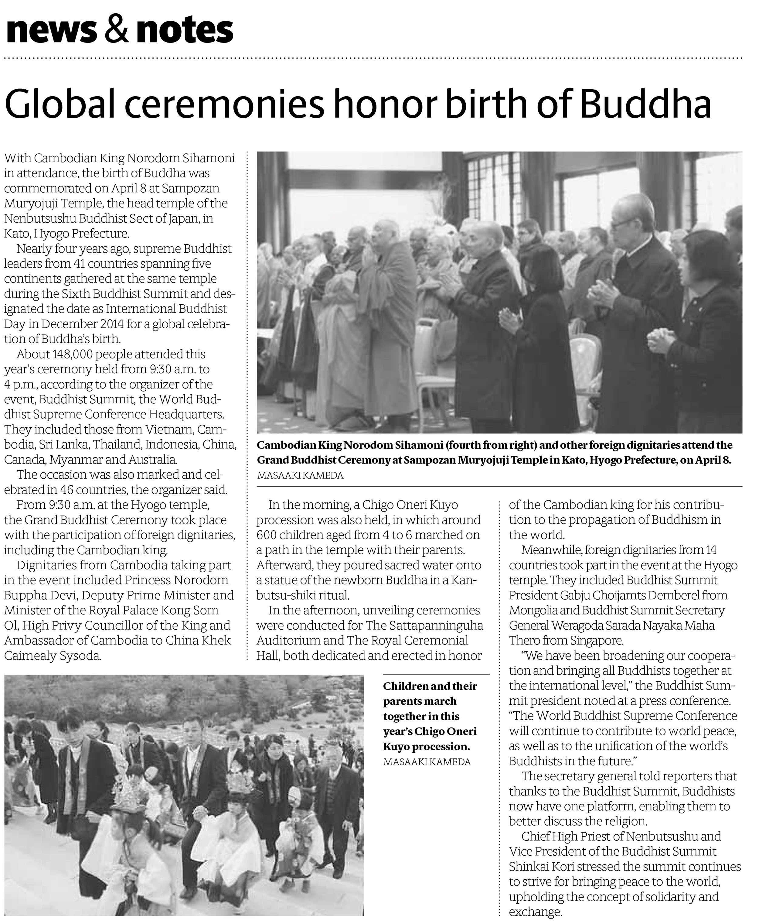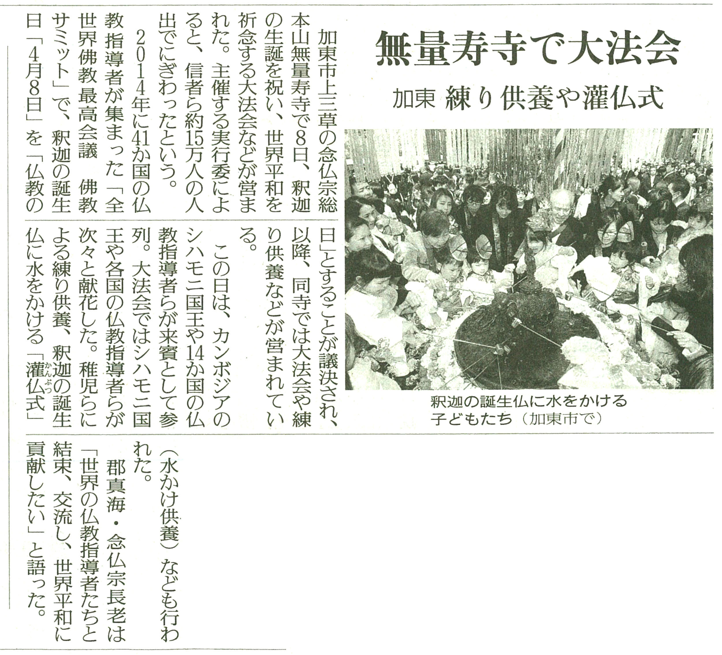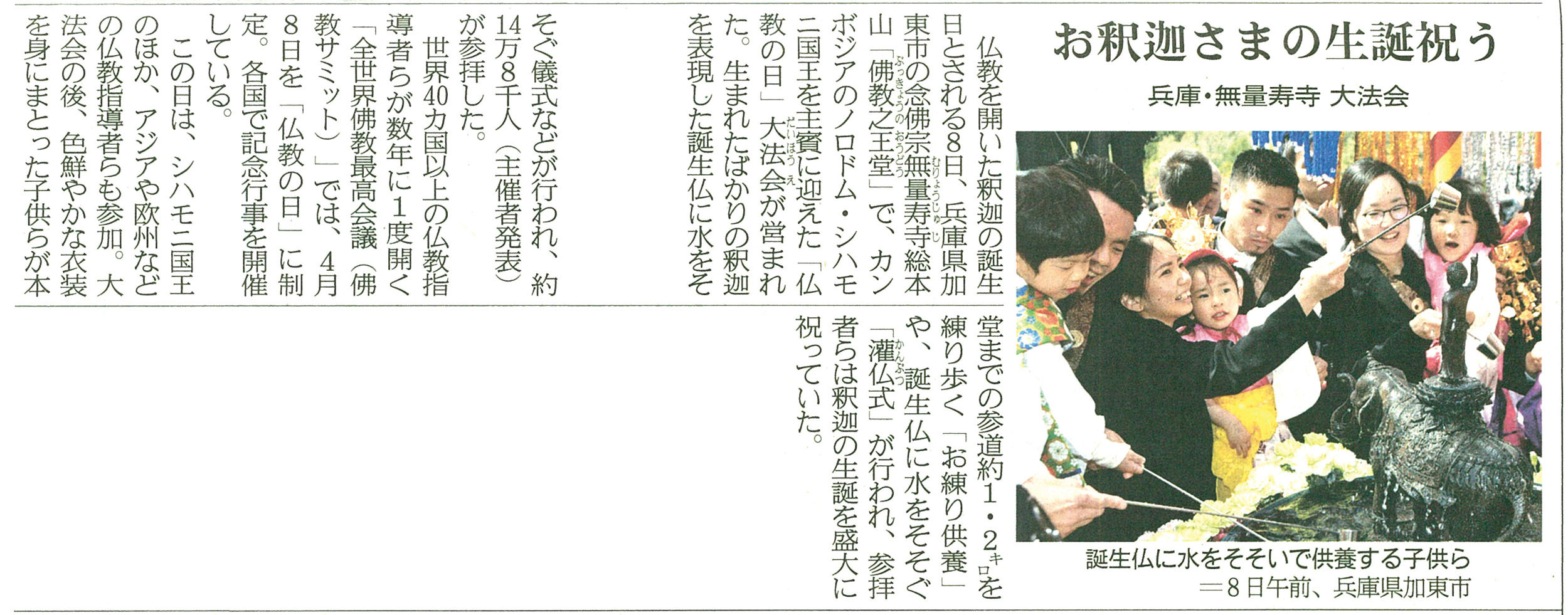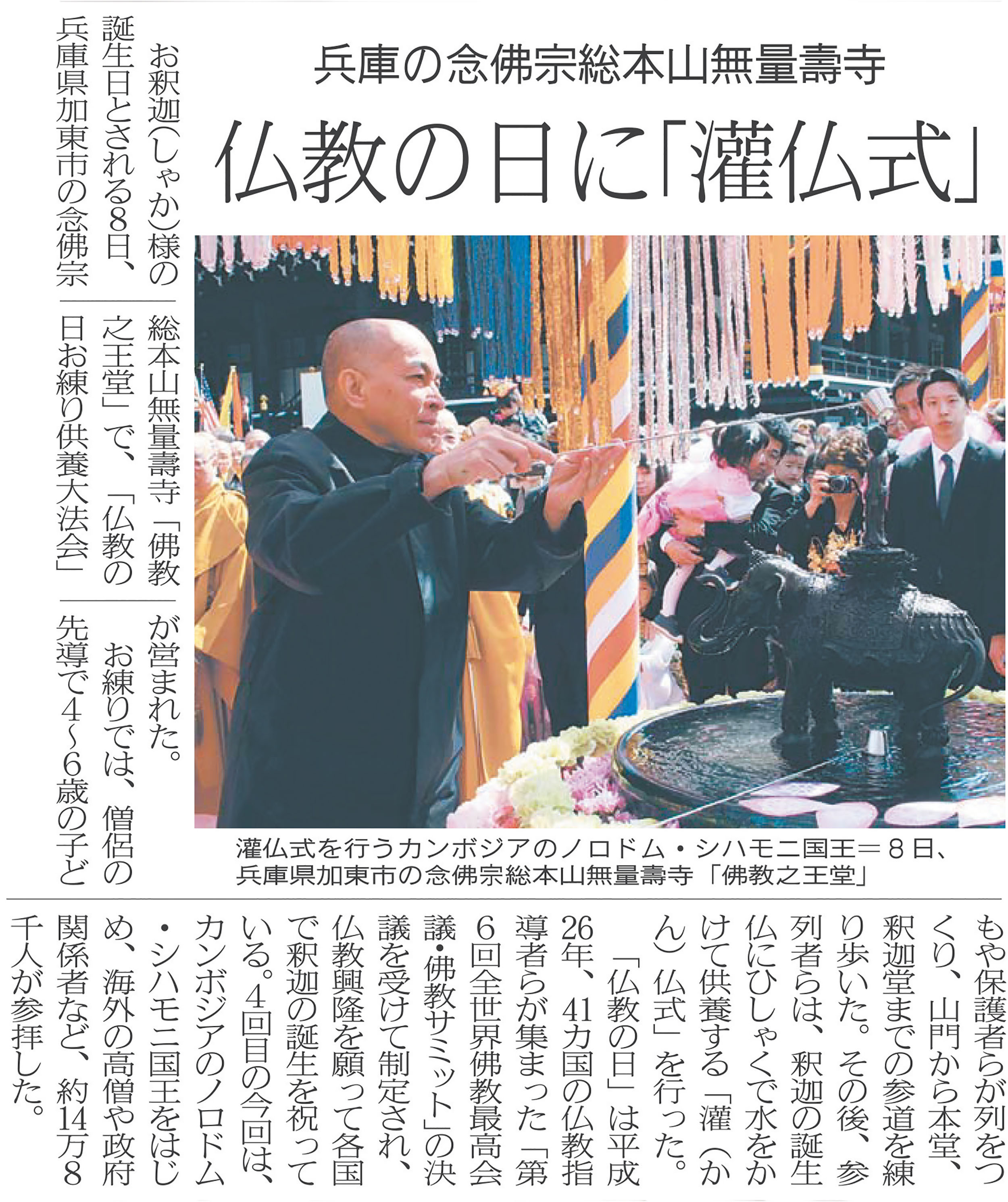 第四回「仏教の日」は、主賓 カンボジア王国 ノロドム・シハモニ国王陛下を始め、14ヶ国の仏教最高指導者、国家指導者をお迎えし、14万8千人が参詣して、釈尊の御生誕をお祝いする一大行事となりました。